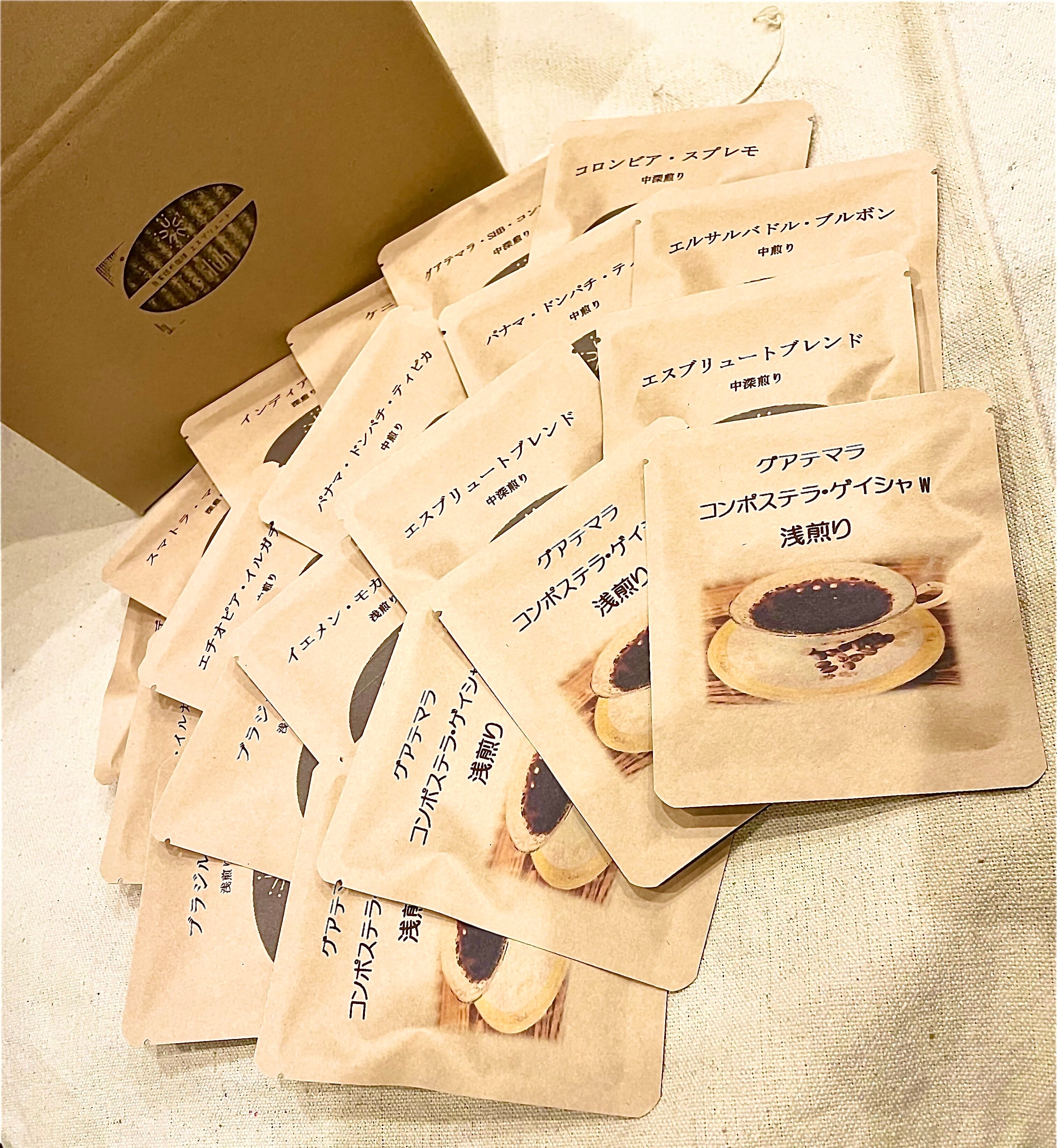 グアテマラ・コンポステラ・ゲイシャWドリップバッグ4P+通常ドリップバッグ16Pが入った、豪華なプレミアム福箱でございます。